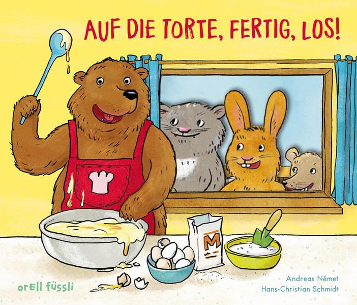 Der Bär rührt eifrig Kuchenteig. Wer schaut ihm denn da über die Schulter?